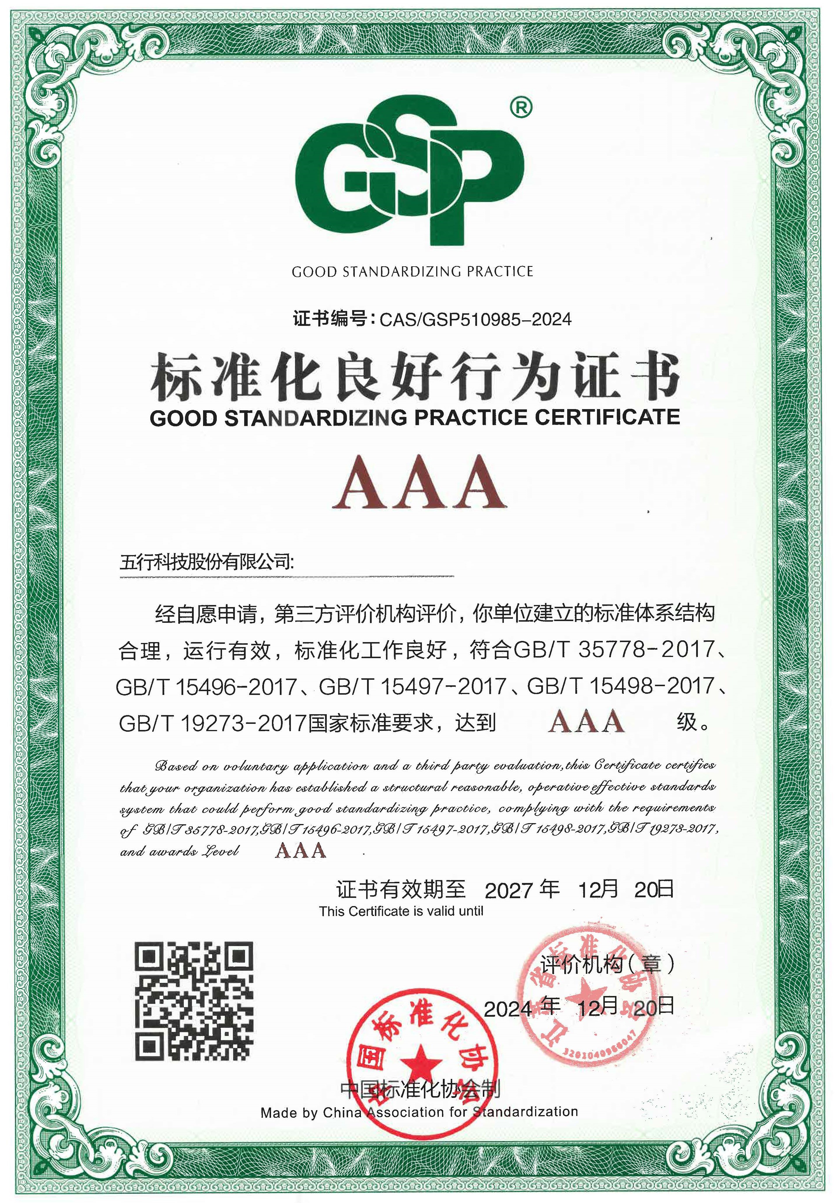 中國標準化良好行為3A證書