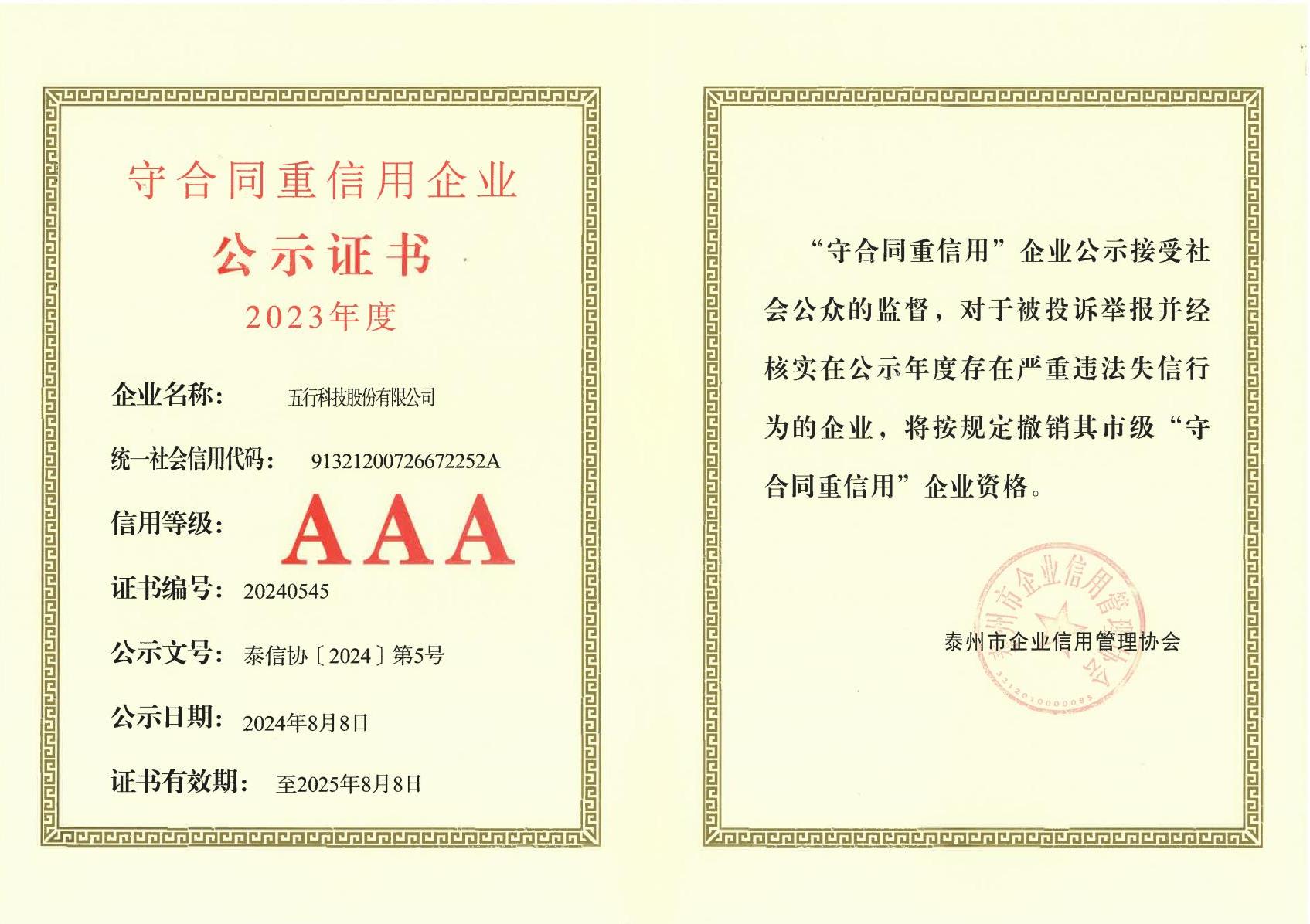 泰州市守合同重信用企業證書2023年度