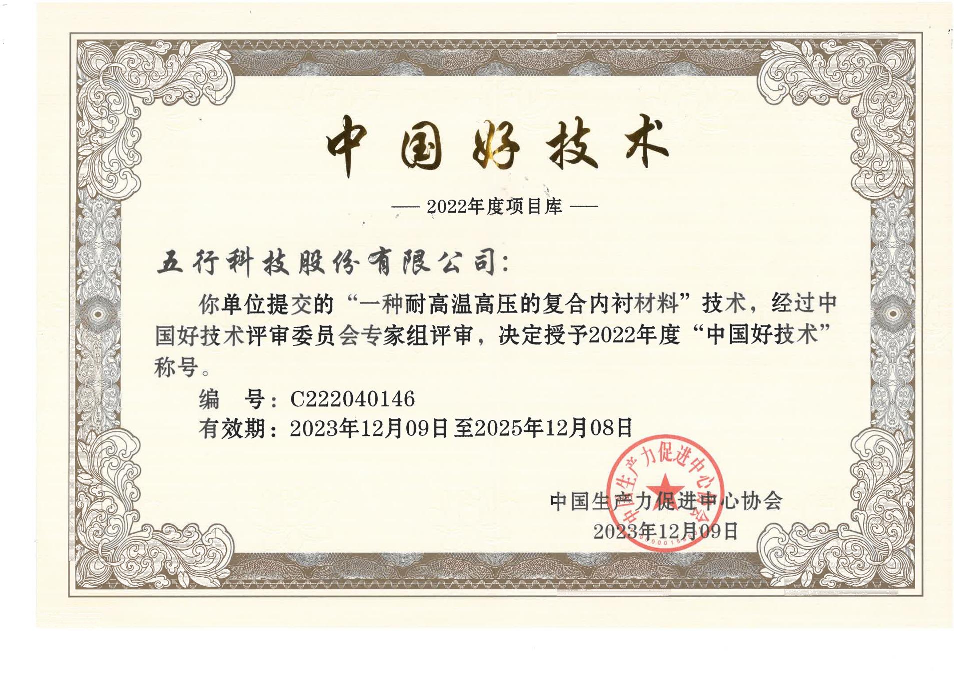 2022年度中國好技術證書