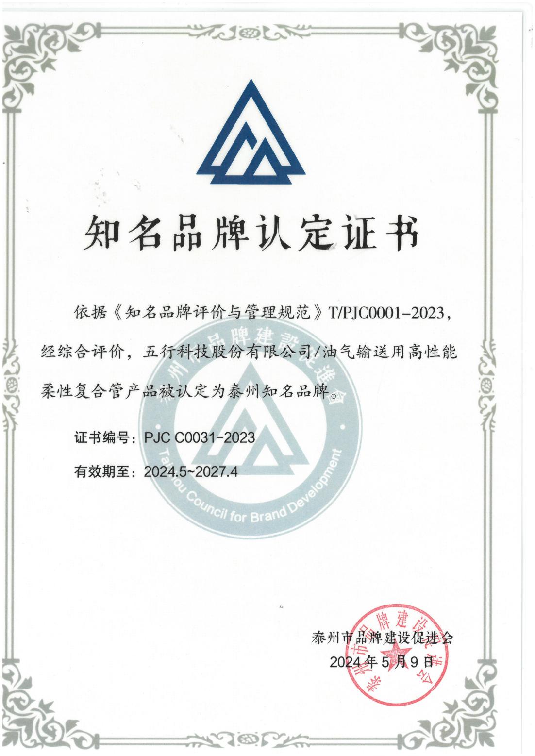 泰州知名品牌認定證書